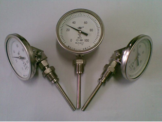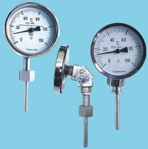 | 雙金屬溫度計是基于繞制成環(huán)性彎曲狀的雙金屬片組成。一端受熱膨脹時,帶動指針旋轉(zhuǎn),工作儀表便顯示出熱電勢所應的溫度值。 |